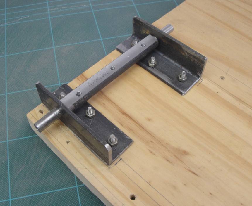 4- Para construir el eje como el de la fotografía se usó una varilla redonda a la que se le tornearon las puntas para que encajen en los orificios de los ángulos descriptos en el punto 3. Si no se puede tornear, reemplazar la varilla por un tubo metálico al que se le pasará una varilla roscada. Atornillar la mesa regulable al eje.